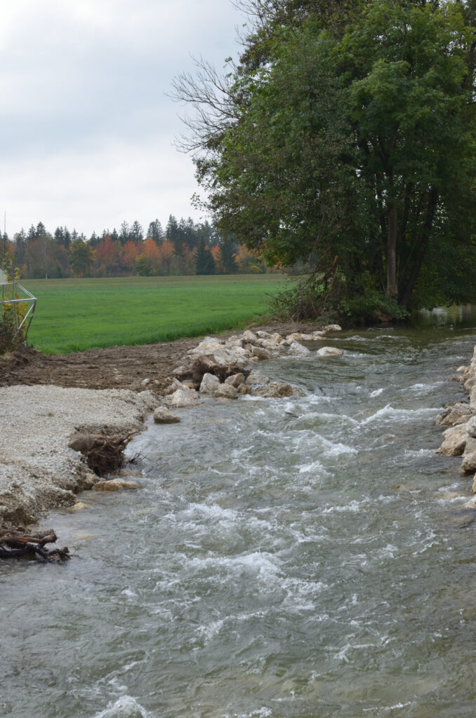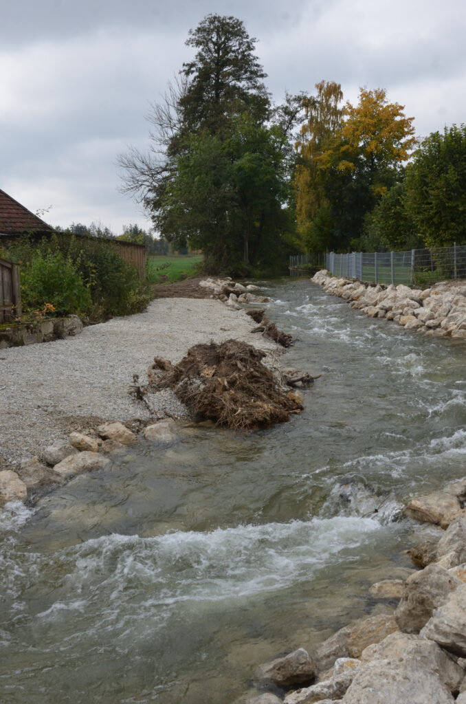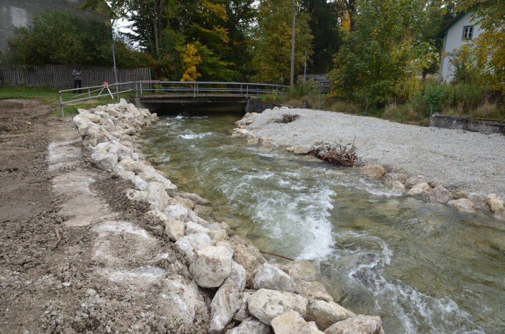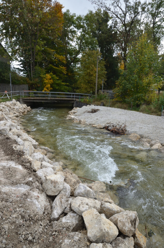 Das Gewässer wurde neu gefasst die Fließgeschwindigkeit wird reguliert, die Ufer werden mit Felsen befestigt und der Wasserlauf wird wieder natürlich gestaltet